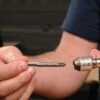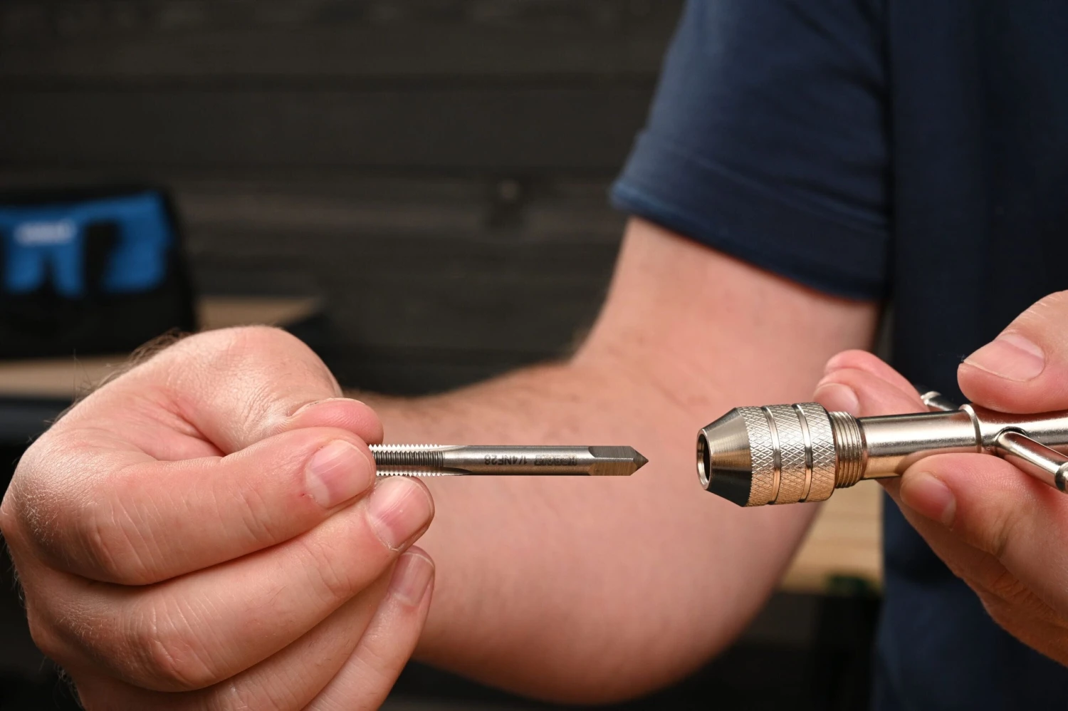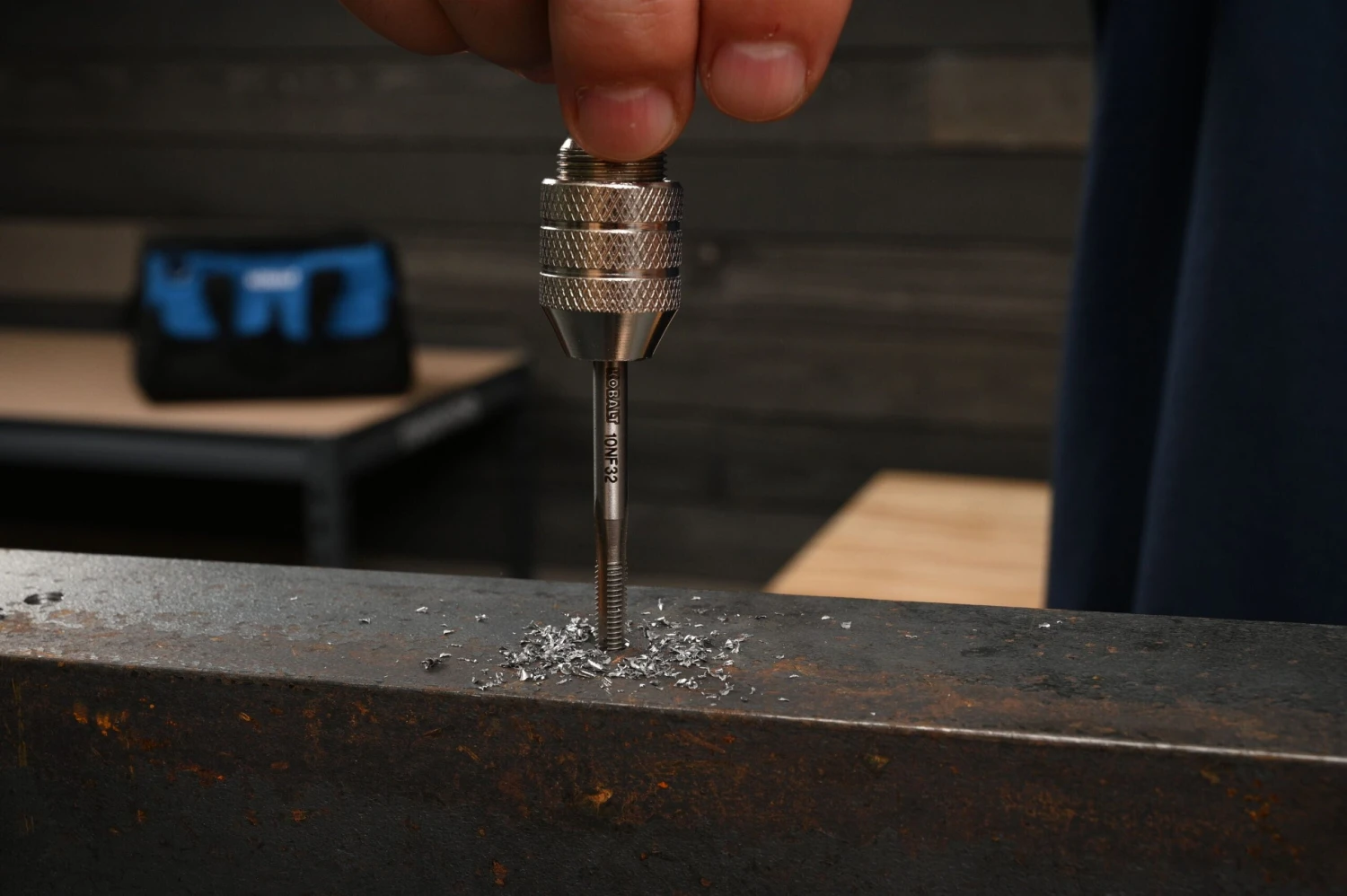 Additional holding jaws are recessed inside the hole for gripping onto smaller sized taps