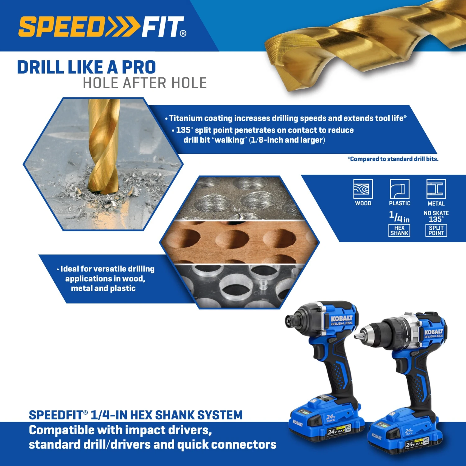 SpeedFit hex shank is compatible with all quick-change connectors, standard and impact drill/drivers