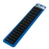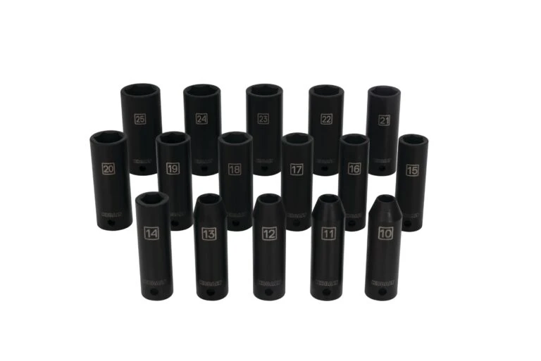 This 1/2-inch drive deep impact socket set contains the following metric sizes 10, 11, 12, 13, 14, 15, 16, 17, 18, 19, 20, 21, 22, 23, 24 and 25 mm