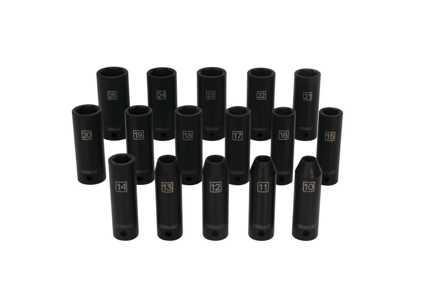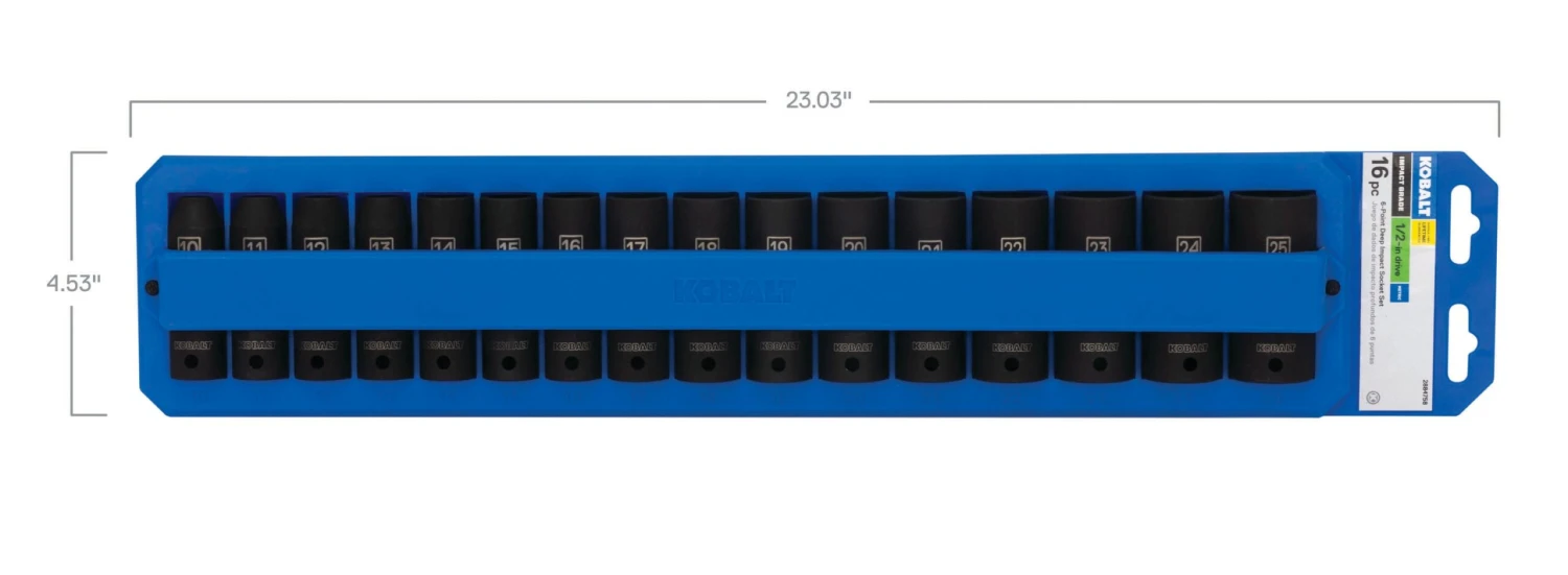 Kobalt’s 1/2-inch drive, 16-piece metric impact socket set includes only deep impact sockets. Sockets are constructed from chrome vanadium steel and are heat treated to withstand everyday use in your home garage or professional shop. This set is intended for use with an impact tool to provide maximum installation of heavy duty fasteners. Each components has a pin hole to safely attach to your impact tool and 6-point sockets have a chamfered opening to help guide socket on to the fastener. Size callouts are laser-etched on each socket for easy identification in or out of the blow-molded carrying case.