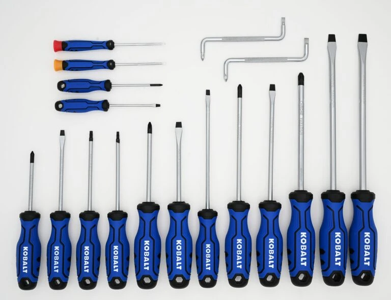 The Kobalt 18-piece Screwdriver Set includes 14 black oxide and heat-treated magnetic tip screwdrivers. The tip size markings are printed on the on the end of the handle for easy identification, while the heat-treated, alloy steel blade offers maximum strength and the precision formed tip ensures an accurate fit. The ergonomic handle provides comfort and power.