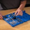 This set includes: tap and die: 1/4 in-20NC, 1/4 in-28NF, 5/16 in-18NC, 5/16 in-24NF, 3/8 in-16NC, 3/8 in-24NF, 7/16 in-14NC, 7/16 in-20NF, 1/2 in-13NC, 1/2 in-20NF, pipe: 1/8 in-27NPT, 1pc die stock, 1pc adjustable tap socket
