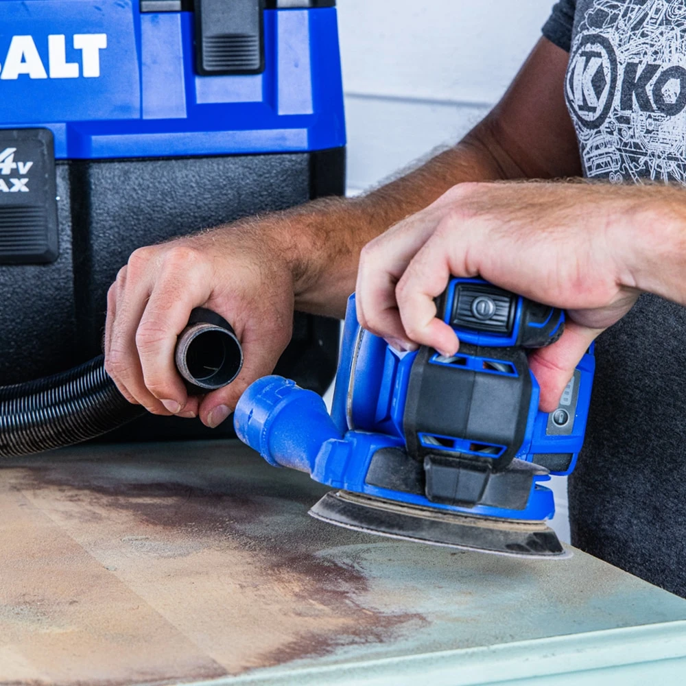 Tackle the most challenging projects with the new, Kobalt 24-Volt Max BRUSHLESS, 5” Random Orbital sander! Tough stock removal, prep sanding, and ultra-smooth finishing are made easy with the combination of vibrating and spinning actions. With the Variable Speed Dial. Soft-Start feature, AND improved shorter profile ergonomics, you have more precision control than ever before. With the power of 24 volts, you get smooth operation, without friction and heat buildup… …even at a blistering 11,000 Oscillations Per Minute. On a 2.0 amp-hour battery, not included, the new Kobalt Orbital sander has an INCREASED 25% runtime, … and improved technology DECREASES vibration by a whopping 60%! The Kobalt sander comes standard with a variety pack of three, 8-hole hook and loop sanding pads… …along with advanced dust collection and extraction. It even connects to the Kobalt 24-volt max, Wet/Dry shop vac! And the brushless motor improves performance & extends the life of your tool. Enjoy worry-free, seamless compatibility with all Kobalt 24-volt batteries*… …and the peace of mind that comes with Kobalt’s 5-year limited warranty.