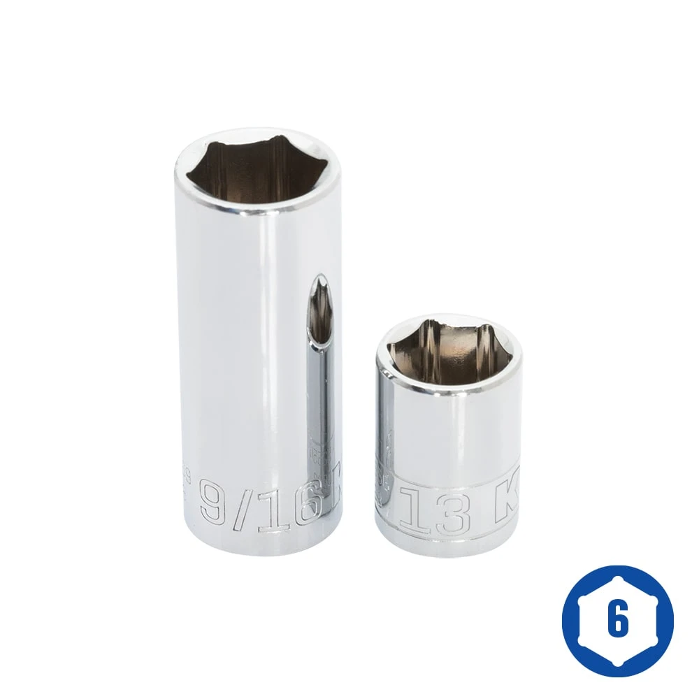 All sockets feature a 6-point design to help prevent slippage and rounding of fasteners