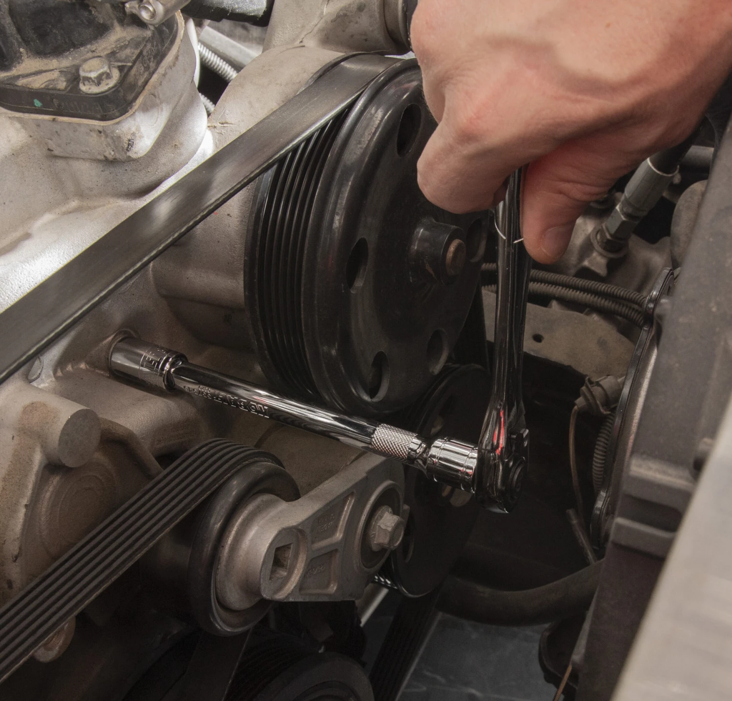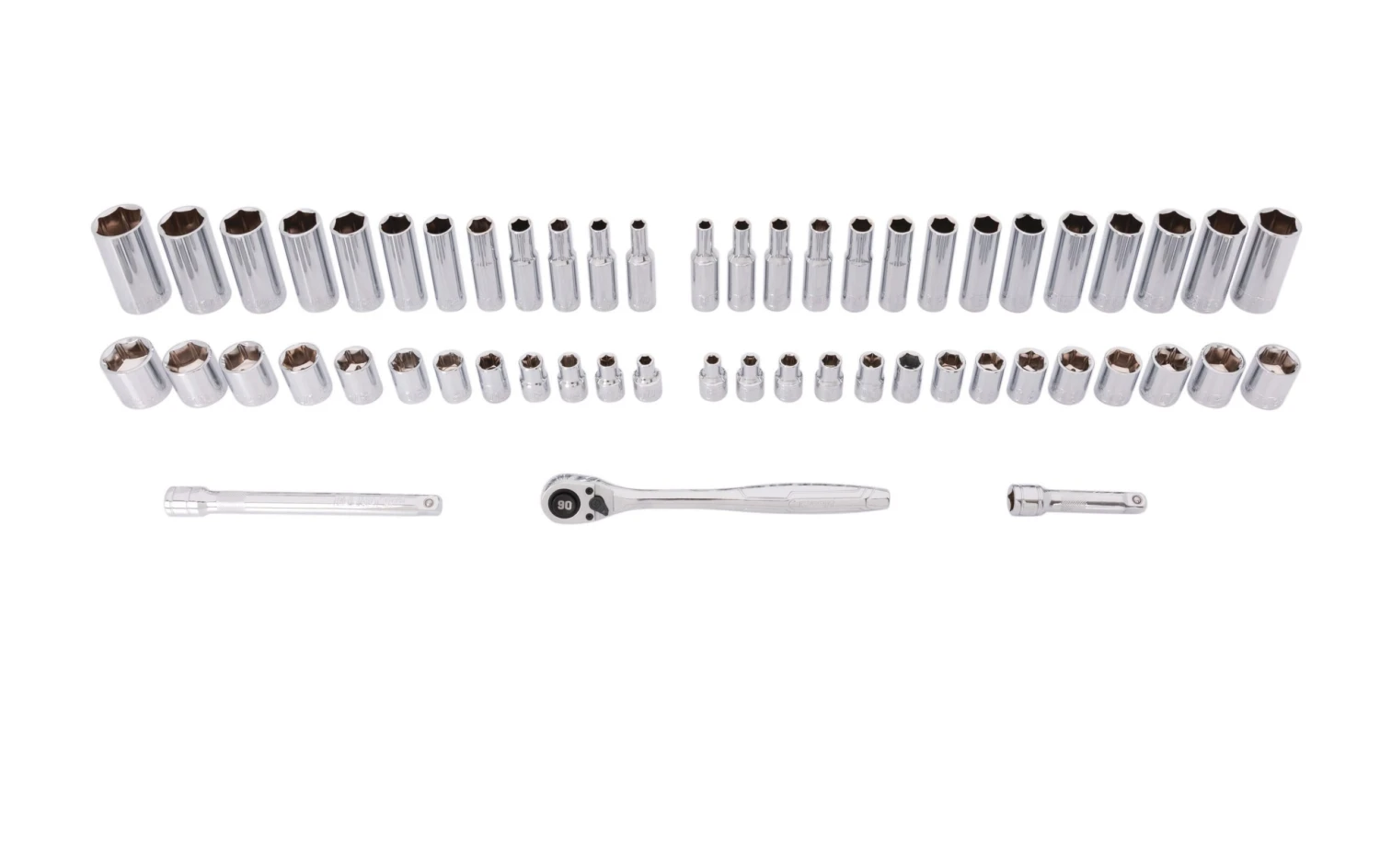 The set features a 90-tooth ratchet and two (2) socket extensions (3-in and 6-in)