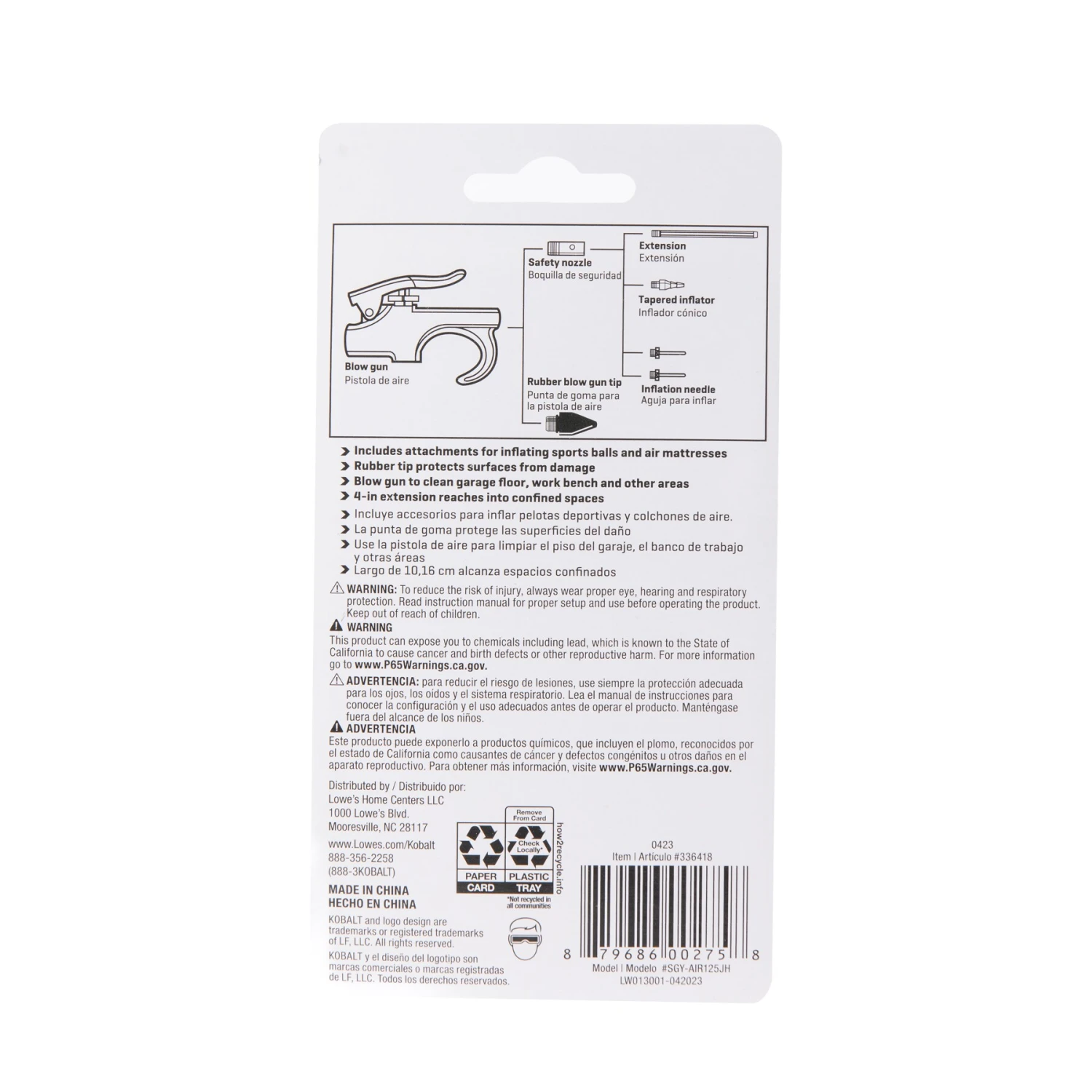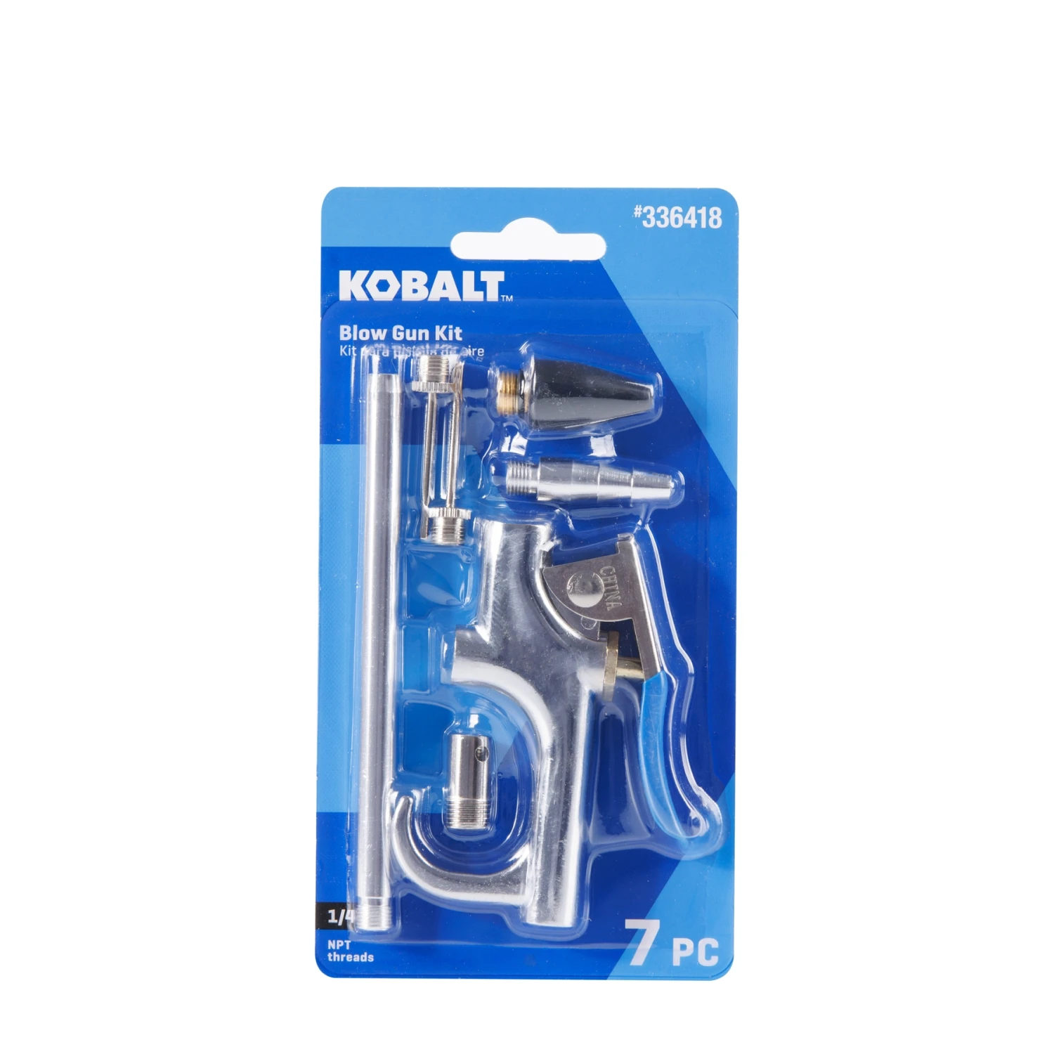 The Kobalt 7-pc Blow Gun Kit provides a versatile solution for cleaning and inflating tasks around your home, garage, or workshop. The blow gun features a 4-in extension nozzle that reaches confined spaces, ensuring thorough cleaning of garage floors, workbenches, and equipment. Equipped with two standard needle tips, the kit also allows for quick inflation of basketballs, footballs, volleyballs, and other sports balls. The convenient thumb control lets you regulate airflow for precise control, making it user-friendly for a wide range of applications. Built to last with durable materials, this blow gun kit is essential for maintaining a clean and efficient workspace.