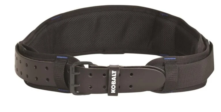 Kobalt’s premium padded work belt provides extra comfort and comes with a double-tongue roller buckle.