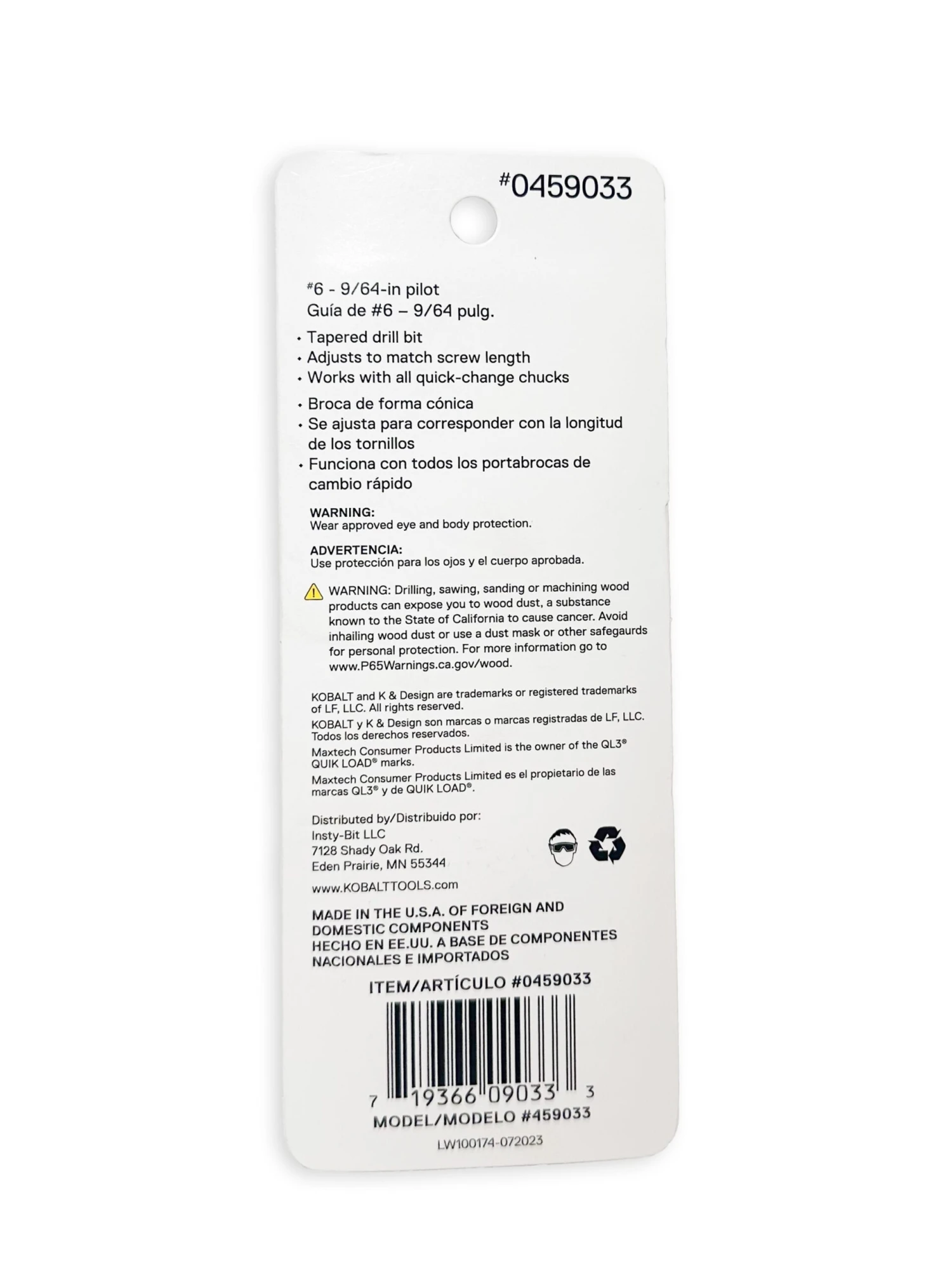 | Bit Diameter (Inches) | 9/64-in, 11/64-in, 3/16-in |